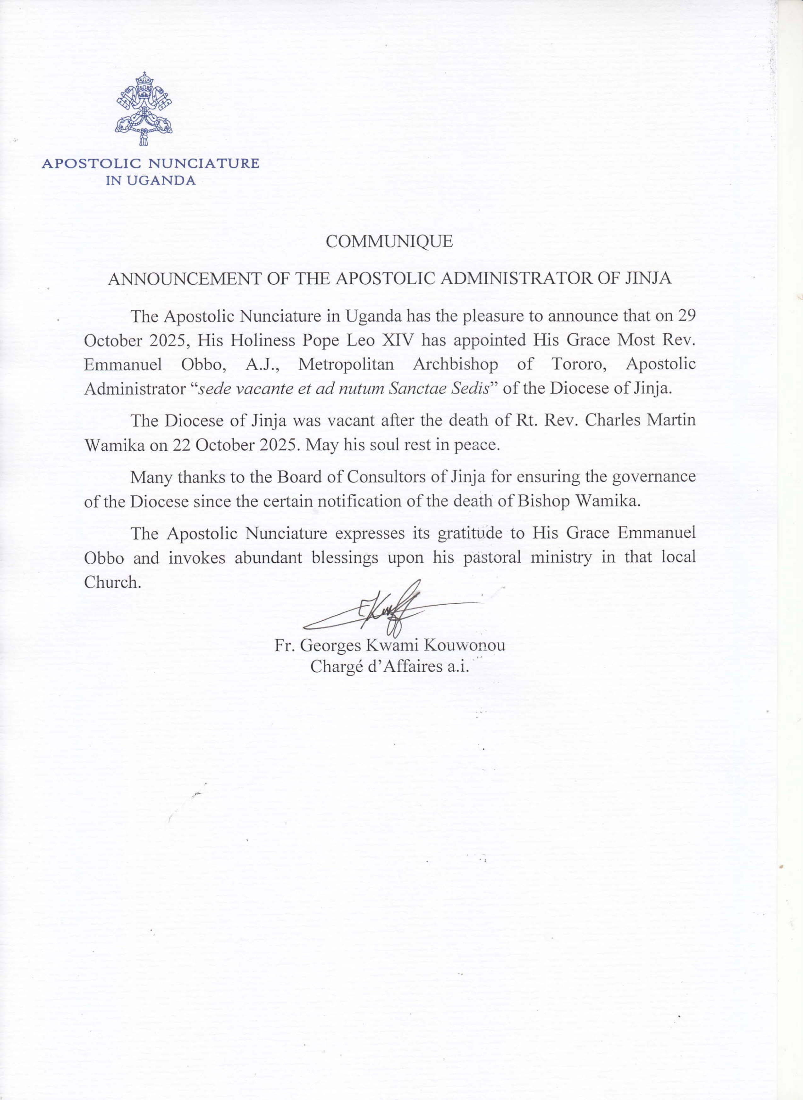 His Grace Most Rev. Emmanuel Obbo Appointed at the new Apostolic administrator of Jinja